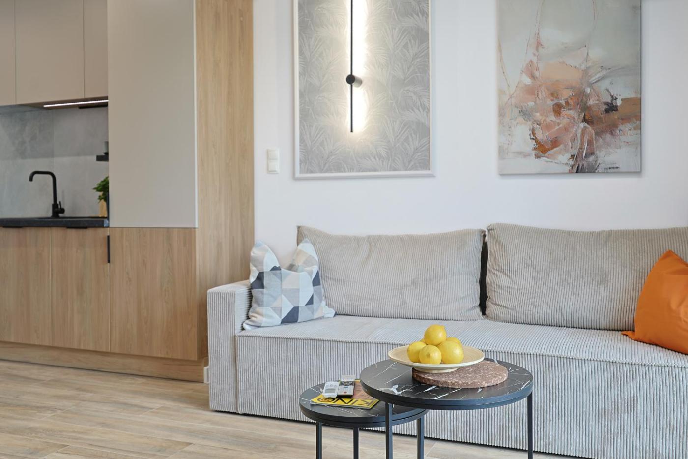 Oferta apartamentu obejmuje sypialnię (1), salon, aneks kuchenny z pełnym wyposażeniem, w tym lodówką i ekspresem do kawy, a także łazienkę (1) z prysznicem oraz suszarką do włosów. W apartamencie zapewniono ręczniki i pościel.