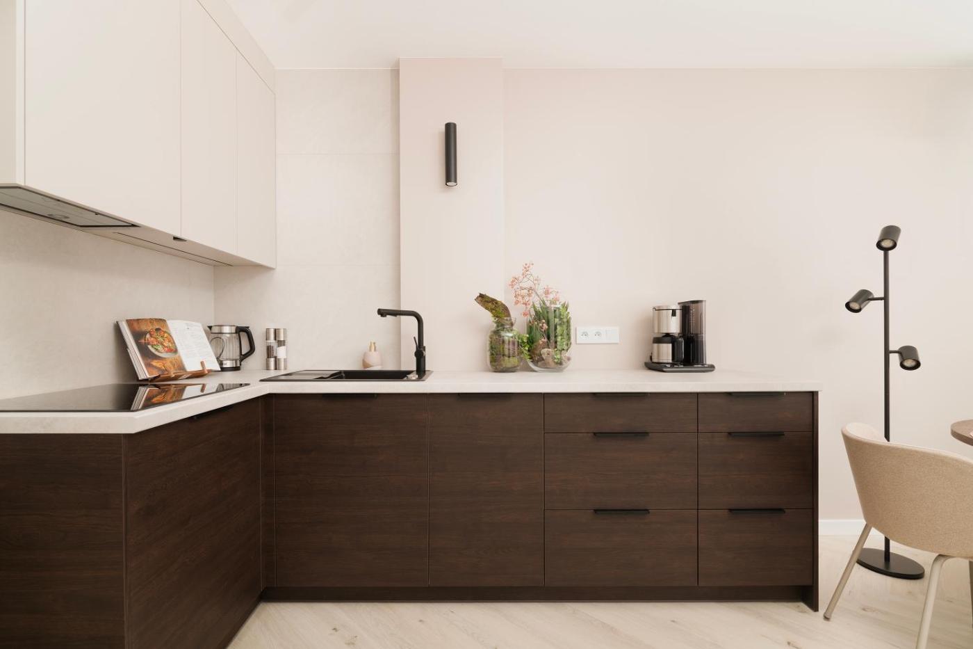 Oferta apartamentu obejmuje sypialnię (1), salon, aneks kuchenny z pełnym wyposażeniem, w tym lodówką i ekspresem do kawy, a także łazienkę (1) z prysznicem oraz suszarką do włosów. W apartamencie zapewniono ręczniki i pościel.