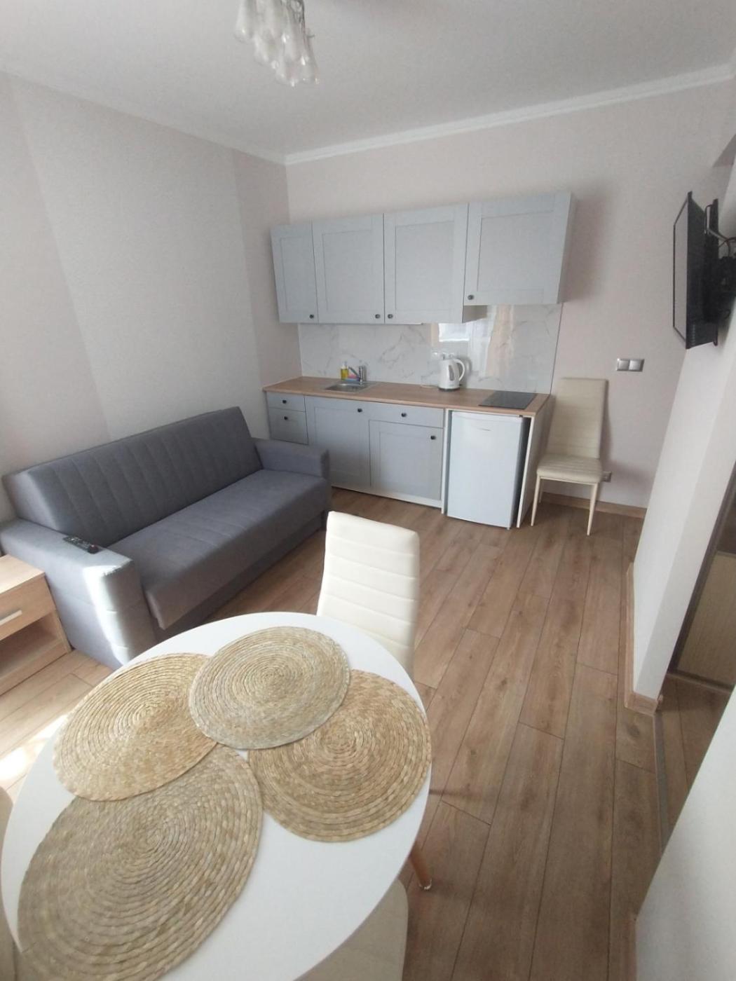 Rodzinny apartament typu Studio. The kitchenette is equipped with a stovetop, a refrigerator and kitchenware. The family room provides a tea and coffee maker, a seating area, a terrace with garden views as well as a private bathroom featuring a shower. The unit offers 2 beds. Rodzinny - 3 osobowy. Powierzchnia pokoju ok.: 22 mkw. ;