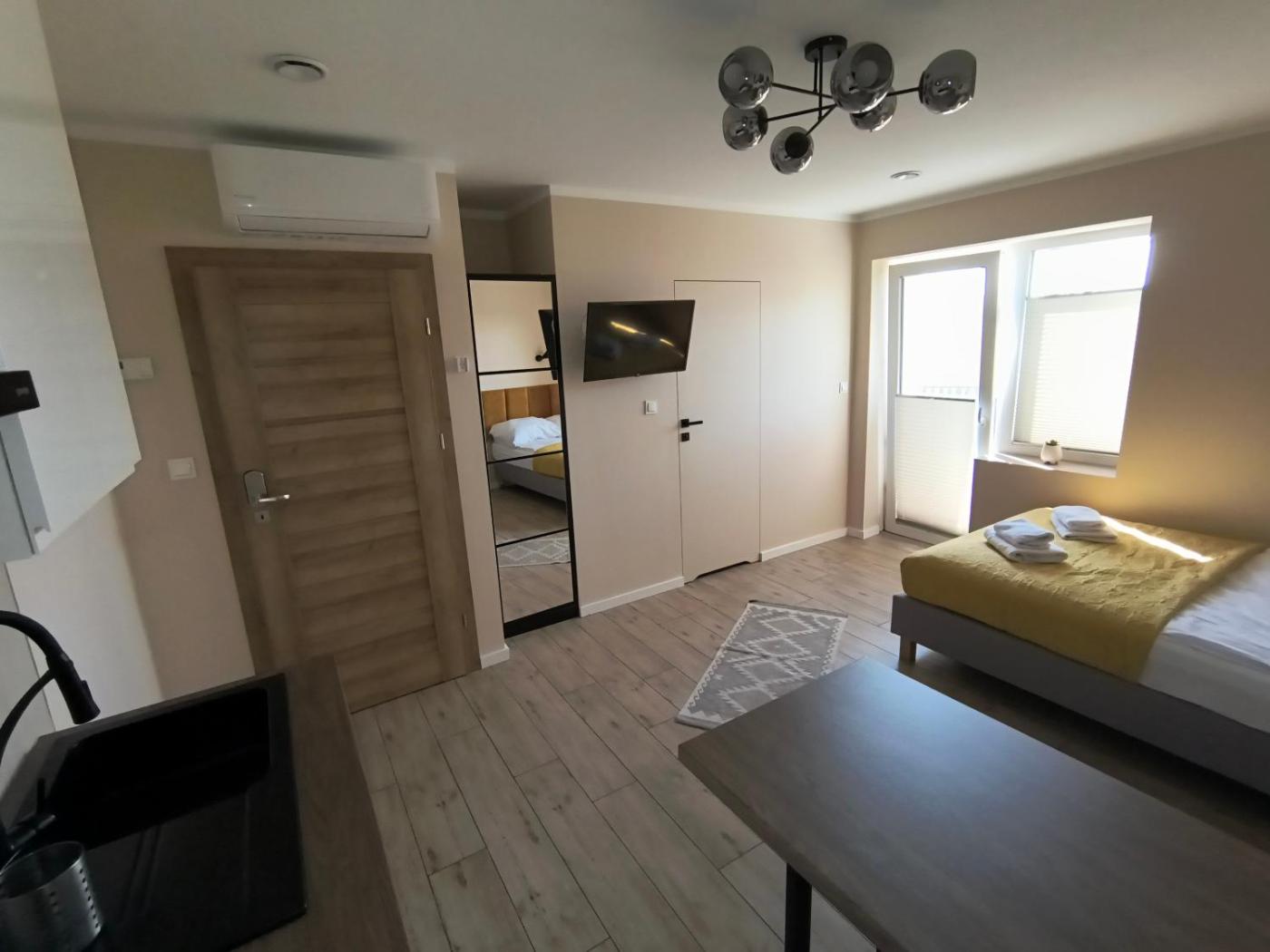 Pokój Dwuosobowy z tarasem. In the kitchen, guests will find a stovetop, a refrigerator, kitchenware and a microwave. The double room provides air conditioning, a dining area, a terrace with garden views as well as a private bathroom featuring a walk-in shower. The unit offers 1 bed. Pokój Dwuosobowy - 2 osobowy. Powierzchnia pokoju ok.: 19 mkw.